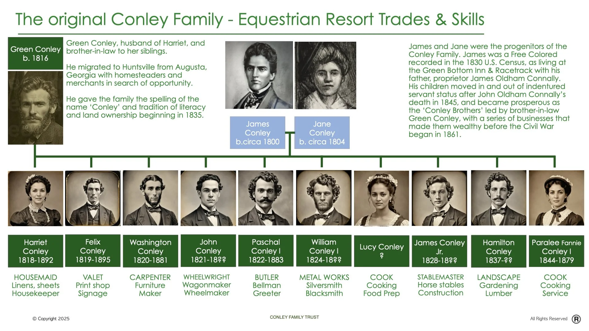 After the death of Green Bottom Inn founder, John Oldham Connally in 1845, the hotel closed and the equestrian center fell into disrepair. The Conley siblings took their various trade skills and offered them throughout the Tennessee Valley as the nation expanded West.